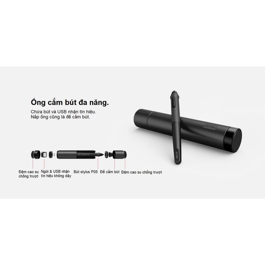 Bút cảm ứng P05 với 8192 lực nhấn vừa vặn trong lòng bàn tay bạn với độ phản hồi 266 RPS làm cho nét vẽ mượt mà và liên tục hơn. Ống đựng bút đa năng đời mới giữ tất cả bút, ngòi dự phòng và cục nhận USB cùng một chỗ an toàn. Nắp ống cũng có thể làm đế cắm bút. Thật tiện lợi để bạn mang đi mọi nơi.