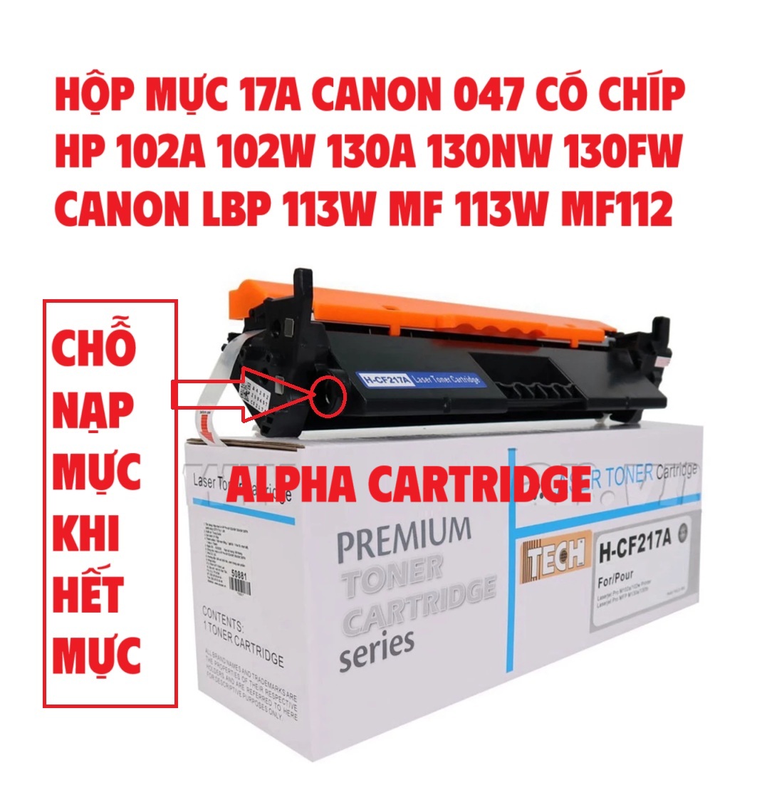 Hộp mực HP 17A , C 047 ,CÓ LỔ ĐỔ MỰC– Chất lượng cao – Mới 100% - Nguyên hộp- Bảo hành 1 đổi 1 trong 1 THÁNG HOẶC ĐẾN KHI HẾT MỰC nếu lỗi do nhà sản xuất. Dành cho các dòng máy in sau:HP LaserJet Pro MFP M130fn HP LaserJet Pro MFP M130fw HP LaserJet Pro MFP M130a HP LaserJet Pro MFP M130nw HP LaserJet Pro M102w HP LaserJet Pro M102aCanon MF113w, MF112HƯỚNG DẪN SỬ DỤNG : - Gỡ hết phần nhựa màu cam(Nếu có) - Rút mạnh siêu nylon ra(Nếu có)- dài khoảng 30cm (tuyệt đối ko đc cắt siêu nylon -sẽ gây khó khăn trong quá trình lắp đặt) - Lắp vào máy in và bắt đầu sử dụng.Hộp mực là có mực sẵn --> Gắn vào là sử dụng được ngay. Có thể nạp mực lại sau khi dùng hết. Nếu có gì khó khăn, vui lòng liên hệ shop.Hàng chính hãng Alpha Cartridge