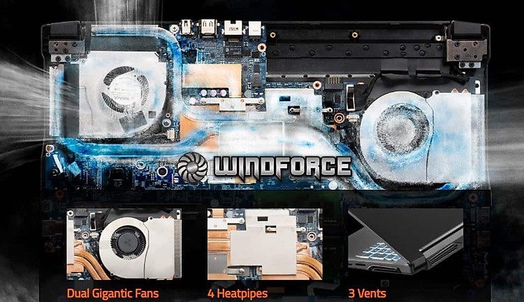 - Laptop gaming gigabyte g5 này được trang bị hệ thống làm mát WINDFORCE mới nhất, hiệu suất làm mát tổng thể của hệ thống này lên đến 150W, không chỉ giúp đạt được 100% hiệu năng CPU và GPU mà nó còn khá ổn định trong điều kiện khắc nghiệt. Mang lại trải nghiệm tốt và tốc độ nhanh hơn khi chơi game hay sử dụng phần mềm đồ họa cao. Quạt kép khổng lồ.