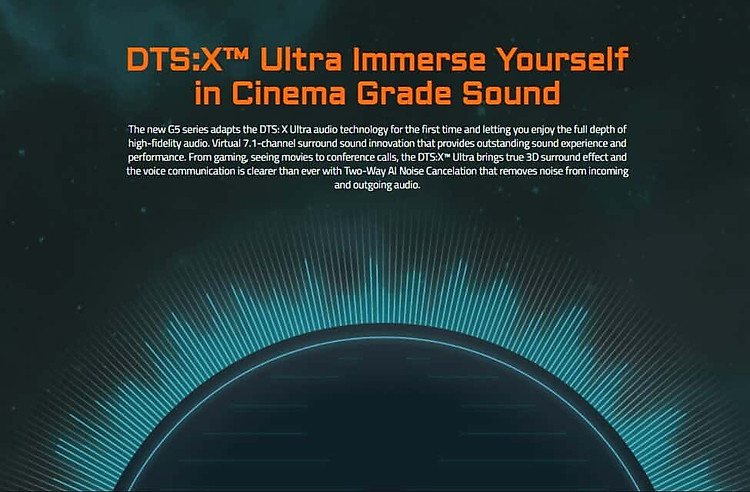 - Máy được trang bị bộ âm thanh DTS: X cho phép bạn tận hưởng toàn bộ chiều sâu của âm thanh có độ trung thực cao. Cải tiến âm thanh vòm 7.1 kênh ảo mang đến trải nghiệm và hiệu suất âm thanh vượt trội. Từ chơi game, xem phim đến các cuộc gọi hội nghị, DTS: X mang đến hiệu ứng vòm 3D chân thực và giao tiếp bằng giọng nói rõ ràng hơn bao giờ hết với tính năng Chống ồn AI hai chiều giúp loại bỏ tạp âm từ âm thanh đến và đi.