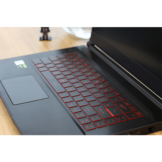 - Msi Gf63 thin có đèn led dưới bàn phím để người dùng thoải mái gõ phím trong điều kiện thiếu ánh sáng như buổi tối, bàn phím trải nghiệm gõ rất tốt, có đèn led làm nền, phím to, font chữ dễ nhìn, nút nguồn tách rời.